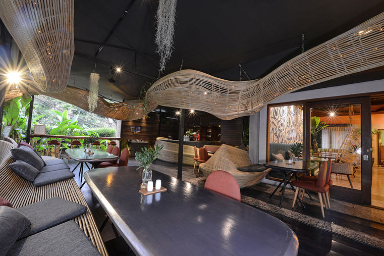 Organic rattan sculptures shape the restaurant’s interior, seamlessly blending decoration with functional furniture. The result is a distinctive space where tropical outdoor vibes meet an artsy, retro-inspired interior—two contrasting elements that complement each other.